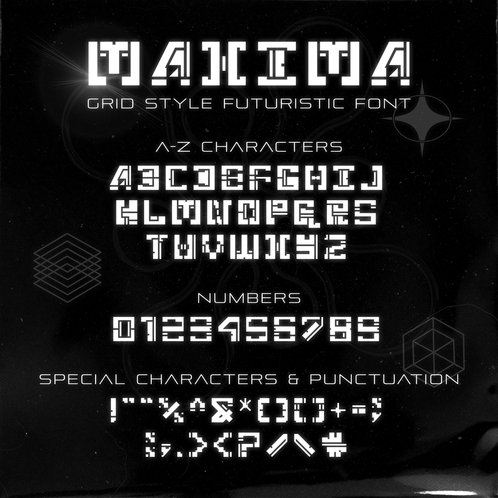 Maxima - a grid styled Futuristic font, based on LCD and Hieroglyph style typefaces. Best suited for titles and large display text.